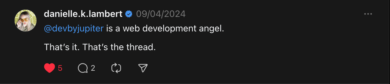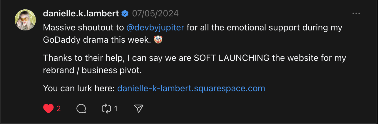 “Kacey is a web development angel. I talked to them about the sales page they’re building me today, and their golden retriever energy wore off on me. And, thanks to Kacey’s valiant efforts, my domain drama is over and my website is actually live. YESSSSS.”