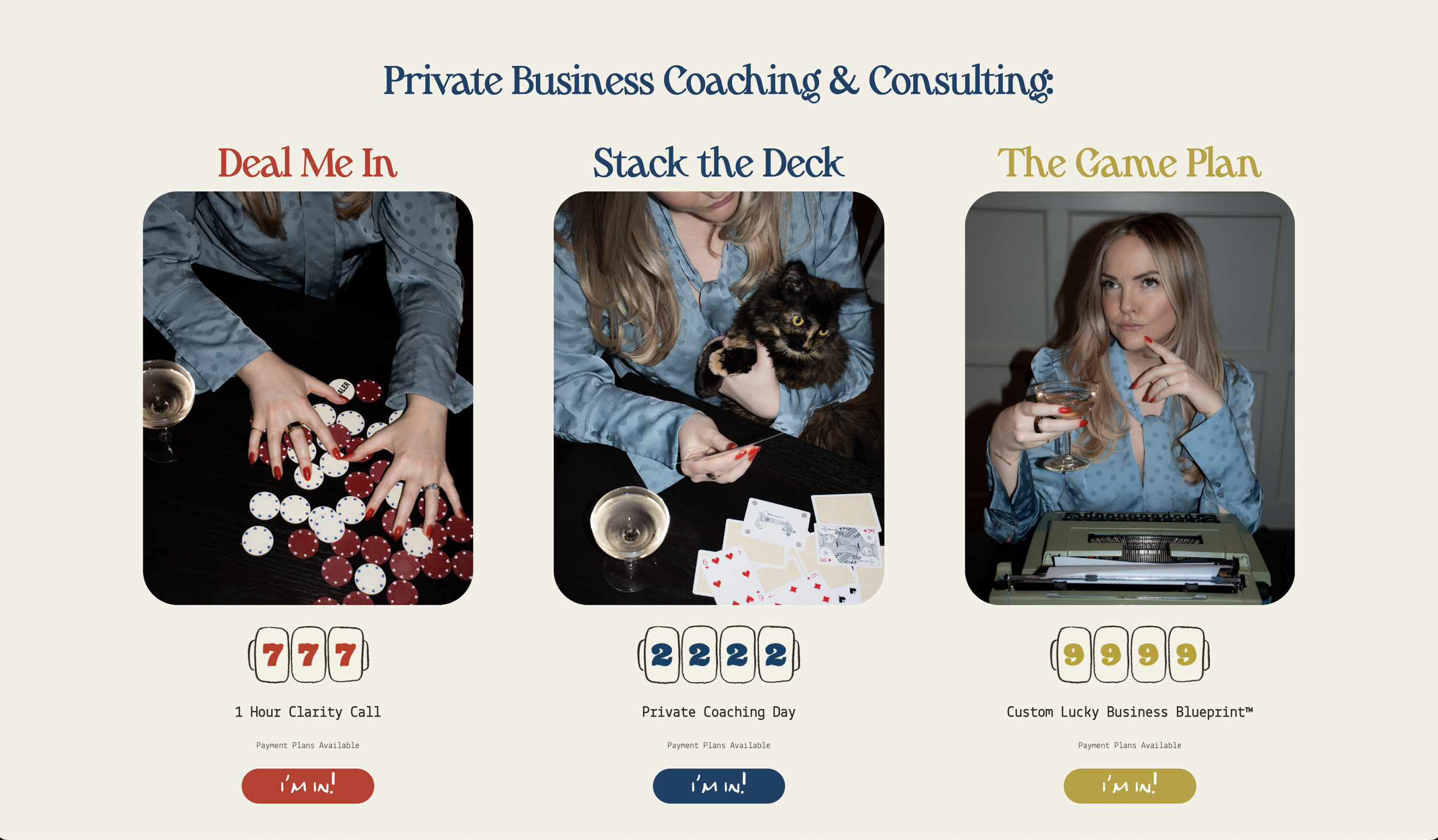 After testing a few methods, I opted to build out this combination gallery section with a 3D transform effect added on the hover state to capture her theme.
